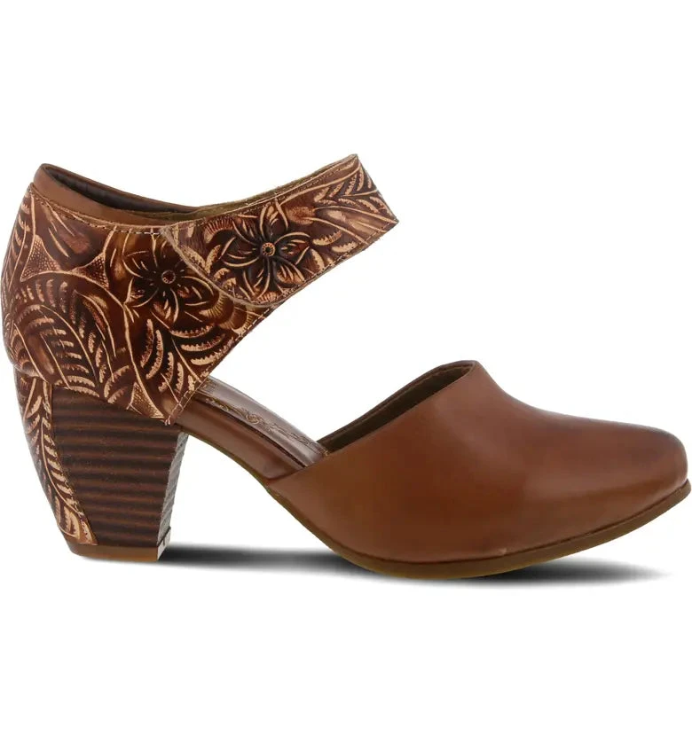 French-inspired, hand-made d’orsay, Mary Jane style, detailed in hand-painted and tooled leather all on a matching tooled leather-wrapped heel.